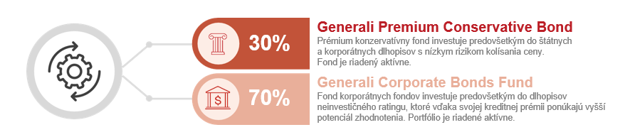 Stratégia kombinuje široko diverzifikované portfólio kreditných dlhopisov s flexibilnou akciovou zložkou, ktorá kladie dôraz na popredné spoločnosti z vyspelých trhov, najmä USA, a dopĺňa ju o perspektívne rozvíjajúce sa trhy. Vďaka zmiešaným fondom, ktoré dynamicky menia váhu jednotlivých tried aktív a zahŕňajú aj komodity či atraktívne príležitosti, dokáže portfólio rýchlo reagovať na meniace sa podmienky na kapitálových trhoch. Menové riziko je do značnej miery zaistené.