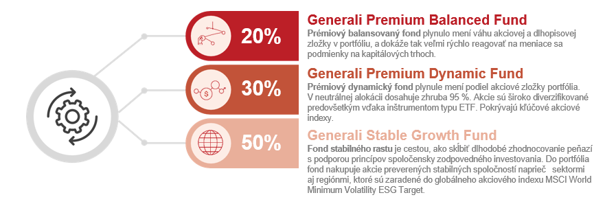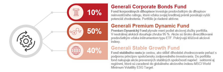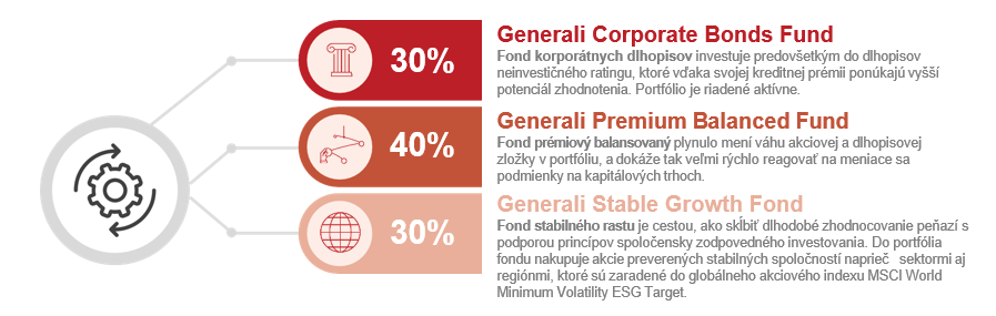 Investičná stratégia kombinuje viac fondov do jedného portfólia a prispôsobuje ich pomer tak, aby zodpovedal rizikovému profilu klienta a časovému horizontu.